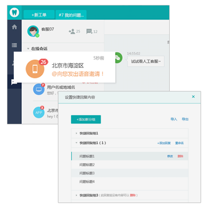 通過人工客服工作臺自定義的快捷回復內容,客服可以一鍵推送內容給客戶,清晰的會話提示、超時提醒、未讀消息等,使得企業客服能一目了然的掌握服務動態,并以 快的速度響應用戶。