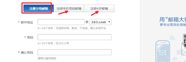 3、點擊后進入網易郵箱注冊頁面,其中有注冊字母郵箱、注冊手機號碼郵箱、以及VIP郵箱,我們可以根據需要任選其一,例如注冊字母郵箱;